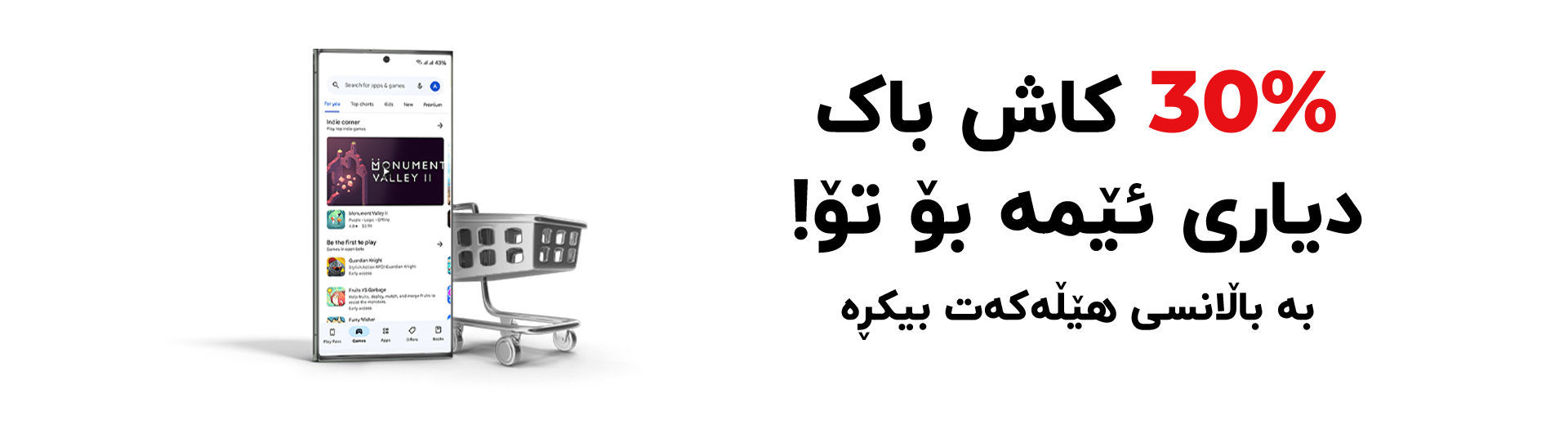 یاری و ئەپڵیکەیشنە دڵخوازەکانت بە ئاسانی بکڕە بە بەکارهێنانی باڵانسی هێڵی ئاسیاسێڵەکەت، و چێژ وەربگرە لە ئۆفەرێکی تایبەت بۆ یەکەم کڕینت و کاش باک "Cashback" بە ڕێژەی 30% بەدەستبهێنە کە دەگاتە 1,500 دیناری عێراقی.