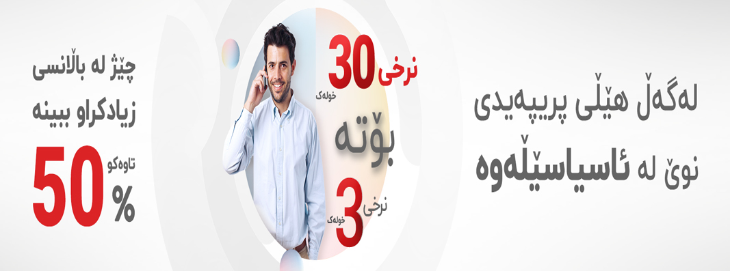 سەرجەم بەشداربووانی ئاسیاسێڵى هێڵی "پریپەیدی نوێ" لە پارێزگای بەغدا، بەسرە، میسان، دیالە ،سلیمانی، تكريت دەتوانن سودمهندبن له نرخی چونیەكی ( 2.8دینار/ چركە) پەیوەندی کردن بۆ ههموو تۆڕهكاني ناوخۆ، لەگەڵ بەدەستهێنانی باڵانسی بێبەرامبەر كە دەگاتە 50% لەكاتی پڕكردنەوەی باڵانس بە 5,000 دینار وزیاتر تا لەگەڵ ئازیزانیان لەسەرتاسەری عێراق لەپەیوەندی زیاتر وباشتردا بن.