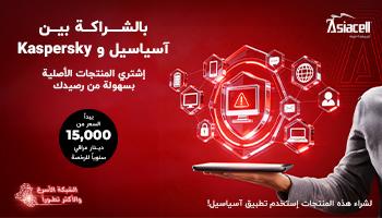 لأول مرة، توفر لك آسياسيل وبالشراكة مع Kaspersky وصولاً آمناً إلی الإنترنت. یمکنك الآن شراء منتجات Kaspersky الأصلية من خلال تطبيق آسياسيل والدفع من رصيد موبایلك، لكي تحمي جهازك وأجهزة العائلة من مخاطر الإنترنت بأفضل طريقة.