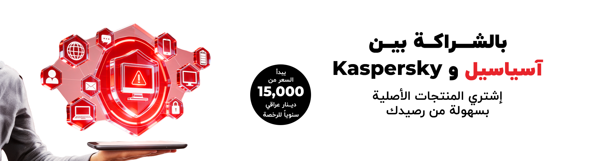 لأول مرة، توفر لك آسياسيل وبالشراكة مع Kaspersky وصولاً آمناً إلی الإنترنت. یمکنك الآن شراء منتجات Kaspersky الأصلية من خلال تطبيق آسياسيل والدفع من رصيد موبایلك، لكي تحمي جهازك وأجهزة العائلة من مخاطر الإنترنت بأفضل طريقة.